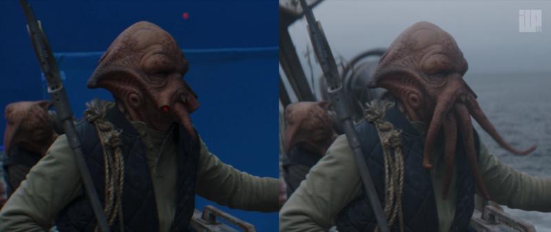 We were already familiar with the squid-like Quarren from the bar fight scene in season 1. For the Quarren in season 1, we developed and animated a full CG head with tentacles, which was added on top of a live action actor. For season 2, there were a lot more Quarren to deal with so the approach was a bit different. The actors wore prosthetic makeup but with detachable tentacles. For any shot that required more nuanced tentacle motion, one with dialogue for instance, the physical tentacles were removed from the prosthetics and were instead animated and added in VFX. The tentacles were keyframe animated, but to improve realism we also ran them through dynamic simulations. The simulation passes were treated as a layer on top of the animation, which we could blend in to taste using the tentacle rig.