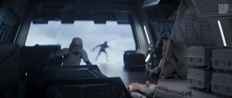 ILP worked on several shots where digi doubles were required, often in the shape of live action to CG takeovers in action packed shots. In this full CG shot, Stormtrooper digi doubles were animated getting pulled out from the cargo area of a Gozanti cruiser.